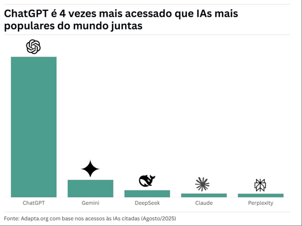 Por método, foram selecionadas algumas das mais populares: ChatGPT, Google Gemini, DeepSeek, Claude e Perplexity. Os números são expressivos, sobretudo da liderança do ChatGPT, com 5,8 bilhões de acessos mundiais.